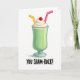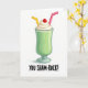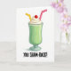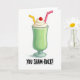 This card shows a cartoon-style green milkshake centered on a bright white background, with a cozy, shareable feel as if it’s meant for two friends leaning in for a laugh 💚. The milkshake is a rich emerald green, sitting in a clear glass with soft highlights that make the liquid and rim look glossy. On top, a tall swirl of white whipped cream rises like a fluffy cloud, and a shiny red cherry rests at the very top like a sweet finishing touch. Two bent straws—one yellow and one pink—angle out from the whipped cream, suggesting a couple of sips shared between close company ☘️. Beneath the glass, the phrase “YOU SHAM-ROCK!” appears in black, hand-drawn lettering, placed low and centered under the illustration. The simple white space around everything keeps the focus on the drink and the flirty little pun, making it feel like a lighthearted wink between pals or partners. Subtle reflections on the glass and the green shake add depth, while the cherry, whipped cream, and twin straws stand out crisply against the white background.