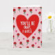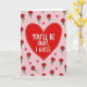 This card shows a large deep red heart in the middle, outlined with a dashed white line like stitching. Inside the heart, the words “YOU’LL BE OKAY, I GUESS” appear in white, simple sans‑serif letters, centered and easy to read. The background is a soft blush pink covered with a repeating pattern of small red roses with green stems. Tiny fuchsia hearts are scattered between the roses, adding a little extra love without taking over. The message feels honest and a bit funny, like something you’d say to someone you care about when you don’t want to be overly sweet 🥰. It’s a nice choice for a partner or close friend who appreciates real reassurance and a gentle laugh. The overall look is warm and romantic, while still keeping things straightforward ❤️. Hope it helps you share your Valentine’s Day sentiments.