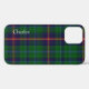 Stylish iPhone 12 case done in a colorful blue, green, yellow, and red traditional Scottish tartan plaid of the Young clan. White text running vertical, on the left side, is ready to personalize. Stylish and great way to protect your electronic device, and makes a great gift idea.