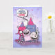 Soft shades of lavender pair with deep pink and purples hues on this cute cartoon monster themed birthday card for a young female cousin.