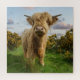 A friendly young Scottish Highland cow is getting close at sunrise. You can even see his eye which is typically covered by his shaggy hair.