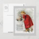 An unbreeched king is standing on a stool and leaning over a pie with a knife in his hand. There's a crown on his blond head and he's wearing a red gown with a bit of lace at the collar. The pie has lots of black birds poking their heads out of the opening and presumably singing in this antique Victorian trade card from 1894.