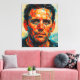 A dramatic portrait painting in an expressive style featuring a young man's face - closeup impressionist painting in oil style fluid brushstrokes in vibrant reds, oranges, yellows, and blue set the tone.