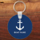 A personalized nautical themed keychain with your boat name, family name or other desired text. This unique design features a custom made classic boat anchor emblem in white on a background of navy blue. If needed, background color can be easily customized by you to match your current decor. Makes a great gift on any occasion for that super captain, skipper or sailor.