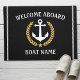 Personalize your home with a Welcome Aboard doormat and your boat name, family name or other desired text. Featuring a custom designed boat anchor with a gold style laurel leaves emblem and nautical rope stripes in white on black or easily adjust the primary color to match your current theme.
