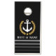 A Personalized Cornhole set with your boat name, family name or other desired text. Featuring a custom designed nautical boat anchor, gold style laurel leaves and star emblem. Easily change the background color to match your current decor or theme. The Cornhole & Bag Toss Set is lots of fun for family reunions, parties, events or just any time. Makes a great gift and conversation piece.
