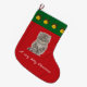 Perfect! Exactly what I ordered! I uploaded a picture of my blue chow, and the screen print was incredible. the back side of the stocking was the red and black checkered print. my puppy's name was also printed on the cuff of the stocking. PERFECT! Highly recommend this product! My puppy's name was screen printed onto the cuff of the stocking, the font was perfect!