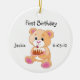 Your Child's First Birthday Teddy Bear Ornament. This cute little teddy bear is holding a small cake. All text (front & back) is fully customizable.