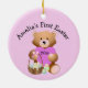 Personalize Your Child's Name First Easter Day Ornament 20xx, with a Teddy Bear holding a big turquoise heart, and an Easter Basket, and butterflies on his feet. All text customizable.