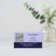 A plain business card template with sans serif letters and a sky blue background and a navy blue stripe at the bottom. Add your own square image or logo to make these business cards your own. Customize it to change card fonts, remove fields, change background colors and more.