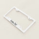 This white license plate frame has text in a black script at the bottom. The text can be edited or deleted.
