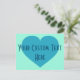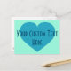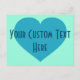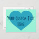 This postcard features a shapely turquoise heart on a light green background overlaid by a text template. Click "Customize it!" to re-size/re-position turquoise heart image, change background color, and personalize text. Choose font, style, size, and color. The reverse side of the card is blank, awaiting your personalized text or handwritten sentiments.