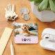 This simple and adorable keychain features your favorite photo of your pet dog or cat, with the word "love" using a paw print in black modern text on a blush pink background. You can add your pet's name or any other message on the back.
