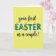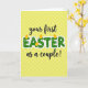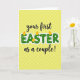 This card features a sunny yellow background with a soft diagonal grid texture that adds gentle depth, like light fabric in spring. Across the center, the phrase “your first” appears in flowing black lettering, setting up a sweet, together-now moment. The main holiday word sits larger beneath it in rich green, edged in white and dotted with tiny white specks that look like dew or sprinkles. Resting on top of several green letters are small oval decorations in warm golden-orange with faint ridges, like little treats placed there with care. The final line, “as a couple!”, returns to the same flowing black lettering, tucked just below to keep the message balanced. With its fresh spring palette and cozy spacing, the layout suggests two people leaning in close, sharing the same excitement 🌷. The green word is centered and dominant, while the black text above and below frames it neatly, all set against the patterned yellow field 🐰. The white outline around the green letters stands out sharply against the yellow, and the orange ovals sit like tiny accents along the top edges of the lettering.