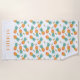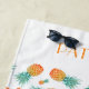 White beach towel with a trendy tropical pineappes fruits foodie pattern design and personalized name print at the top.