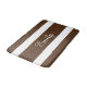 Elegant bath mat with a brown and white colored striped pattern and a personalized name print. Matching bath decor available.