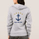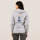 Stylish woman's zip-up hoodie with a custom classic ship's anchor, 5 gold colored stars and your personalized name, boat name or other desired text in navy blue on gray. Printed on front and back. Choose from multiple colors and make adjustments to match your boat gear. Makes a great gift for any occasion. Perfect for any time of year.