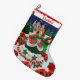 Perfect! Exactly what I ordered! I uploaded a picture of my blue chow, and the screen print was incredible. the back side of the stocking was the red and black checkered print. my puppy's name was also printed on the cuff of the stocking. PERFECT! Highly recommend this product! My puppy's name was screen printed onto the cuff of the stocking, the font was perfect!