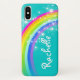 Help protect your child's iphone from knocks and kiddy accidents, with this pretty rainbow design for girls iPhone case. Personalise with your childs name. This example reads Rachelle. Exclusively designed and illustrated by Sarah Trett. www.sarahtrett.com