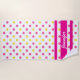 Hot Pink and Sun Yellow polka dots with three pink stripes on one end, this is where you personalize with your name in white - you can change the text , color and add a background color to this design - we left the background white.