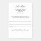 This beauty salon appointment reminder says "Your Next Appointment" and has lines for the date and time of the appointment as well as the stylist's name. At the bottom, there's display text you can edit to create a custom message if desired. (Shown: Kindly provide 24 hours notice if unable to keep your appointment.) Additional display text is near the top for the salon name and its address, phone number, and website. All text can be edited or deleted. The text is black.