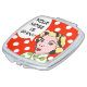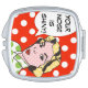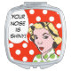 If we've learned one thing from classic television, it's that there is no greater crisis than a shiny nose! This fun compact mirror design features a pop art drawing of a woman wearing green and white polka dots with a speech bubble that says, "Your nose is shiny!" Her raised eyebrows, perfectly coifed hair and ruby red lips give her an authoritative air. The woman and thought bubble are on a red and white polka dot background.