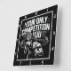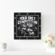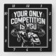This black wall clock features the motivational text "YOUR ONLY COMPETITION IS YOU" in a bold white font with a dynamic, slightly angled arrangement. Below the text is a graphic of a muscular individual, who appears to be a light-skinned man, intensely lifting a barbell during a workout. The design emphasizes personal improvement and self-competition in fitness.