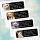 Return address labels with photo template to add a picture of your pet. Upload a favorite photo of your furbaby, or any other photo, to the square template on the left side of this black sticker with white text. This label will hold 3 or 4 lines for the address. You may also use the sample white kitten image if you like, cause she's a cutie! All labels will contain the same photo, or place a new order with another picture.
