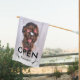 Open business flag for a hair salon you personalize with a photo of your work with OPEN and Welcome! written at the bottom of the open flag with black scissors.
