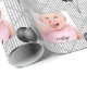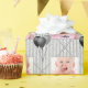 This graphic design is a simple stripes pattern with silver gray and white stripes, balloons, confetti, and a square picture frame for your photo and name.