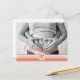 Your modern coming soon photo pregnancy announcement card with a your creative photo added and your names and month of baby's arrival. Cute peach border with painted heart.