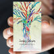 This unique business card is decorated with a colorful mosaic design on a green background.