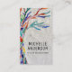 This unique business card is decorated with a rainbow-colored mosaic tree design on a soft gray background and stylish modern typography.