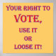 Our Right To Vote is is one of our most powerful tools to maintain our freedom. This November's election, more than anytime in America's history, you MUST exercise this right or it along with all of or other rights will soon be lost. The bright red letters of this design trimmed in blue will help you spread this most important of all messages to everyone around you. REMEMBER IF THE ELECTION IS NOT CLOSE THEY CANNOT STEAL IT!