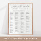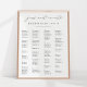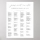 Wedding guest seating chart in classic black and white features "your seat awaits" at the top in elegant calligraphy script lettering, with your guest table assignments beneath, arranged alphabetically across four rows. Accommodates up to ~100 guests; use the design tool to reduce font size if more space is needed.