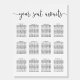 Wedding guest seating chart in classic black and white features "your seat awaits" at the top in whimsical handwritten calligraphy script lettering, with your guest table assignments beneath. Space provided for up to 12 tables.