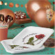 This design is floral photography of one red rose with a stem. The flower was cut out and placed in the center of the plate with a shadow. There is a faded white graphic trellis in the background.