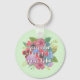 Words to live by, for you or for a friend! Our blossoming garden floral keychain features "Your Vibe Attracts Your Tribe" in white brushstroke typography on a bed of multicolored wildflowers and leaves in soft watercolors. Shown on a pale spring green background.