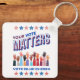 Colorful 2024 Democratic party election keychain features diverse raised hands with "your vote matters" and "Vote blue in 2024" text.