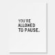 "A minimalist design featuring the empowering phrase 'YOU'RE ALLOWED TO PAUSE.' in a bold, distressed black font against a light grey background. The design serves as a gentle reminder to take a break, rest, and prioritize self-care amidst life's demands. It promotes mindfulness and mental well-being."