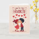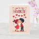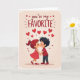 This greeting card shows a young boy and girl sharing a sweet kiss in the center, with their eyes closed and their cheeks a little pink. The girl has bright red hair pulled into a ponytail, and she’s wearing a red dress with matching shoes. The boy wears a red shirt with dark pants, and they’re holding hands, which makes the moment feel close and caring. Above them, red hearts of different sizes float around like a little shower of love. Near the top, the card says “you’re my FAVORITE,” with “you’re my” in a smooth cursive look and “FAVORITE” in bigger capital letters, all in dark lettering. The background fades from light beige into a soft rosy pink, keeping the focus on the couple and the hearts. It feels meaningful to give because it’s simple, honest, and says what you might feel but not always say out loud 🥰❤️.