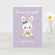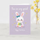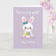 This card shows a white, long-eared bunny character 🐰 sitting in the center, with soft pink inner ears, heart-shaped rosy cheeks, and big gentle eyes that seem to gaze with affectionate warmth. A small teal bow rests on its head, adding a sweet touch of color against the pale fur. The bunny holds three decorated oval eggs close to its chest, as if saving them for someone special, with stripes in sunny yellow, fresh green, and soft lavender. Behind it, the background is a calm lavender field sprinkled with small five-pointed yellow stars that look like tiny sparks across the page 🌷. A line of dark teal text sits near the top, curved above the character, and a second line of matching text is placed along the bottom, framing the scene. The rounded shapes and pastel tones give the whole layout a cozy, friendly look, and the bunny’s pose suggests a tender, caring bond. On the bunny’s feet, the paw pads are shaped like little hearts in pink.