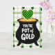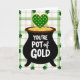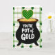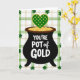 Designed with a festive St. Patrick’s Day scene, the center features a sturdy black cauldron brimming with shiny gold nuggets that look slightly raised and weighty. Rising from the treasure is a rich green heart trimmed in metallic gold, dotted with tiny gold spots that give it a sweet, affectionate touch. The heart floats upward as if it’s being offered, like a small romantic or friendly gesture tucked inside the lucky find 💚. Across the front of the pot, bold white letters read “YOU’RE POT of GOLD,” standing out clearly against the dark surface. Behind everything is a soft green-and-white plaid background that feels like a cozy cloth laid out for a holiday moment. Dark green shamrocks are scattered around the plaid, adding little accents without crowding the main image ☘️. The gold border around the heart catches the light effect, while the pot’s curved rim and the clustered coins create a strong focal point in the middle of the card, and it’s a friendly way to share St. Patrick’s Day sentiments.
