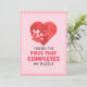 You're The Piece That Completes My Puzzle Valentine's Day Card** features a beautiful heart puzzle, symbolizing the perfect fit between you and your loved one. The vibrant puzzle pieces in Valentine's hues and the heartfelt message "You're The Piece That Completes My Puzzle" make it an ideal way to express your love. Perfect for anniversaries, Valentine's Day, or any occasion to show someone special how much they mean to you.