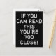 A funny quote in a distressed font. The phrase reads: If you can read this you’re too close.