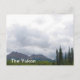A scene from the Yukon Territory; trees and mountains on an overcast day.