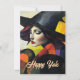 A Yule and Winter Solstice card featuring a witch with red hair and black hat. The front says: Happy Yule. The back says: And Winter Solstice. This is a flat card, two-sided card.