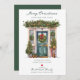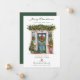 This festive moving announcement features the saying "Merry Christmas from Our New Home" with a beautiful watercolor green front door adorned with Christmas trees, pine garland and wreath. The announcement is perfect for sending to friends and family during the holiday season to let them know about your new address. The front of the announcement features the saying and watercolor green front door, and includes your new address and contact information. The overall design is festive and inviting, and the announcement is sure to put a smile on the faces of your loved ones.