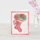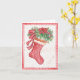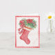 Holiday stocking filled with holly, berries, poinsettia, and ribbon. Greeting card with sentiment inside,