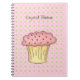 "This yummy little cup cake note book is just the right size for note taking at work or school. Image features polka dots on a pink background and a yummy pink cup cake with sprinkles. Customize this gem by adding your own text."